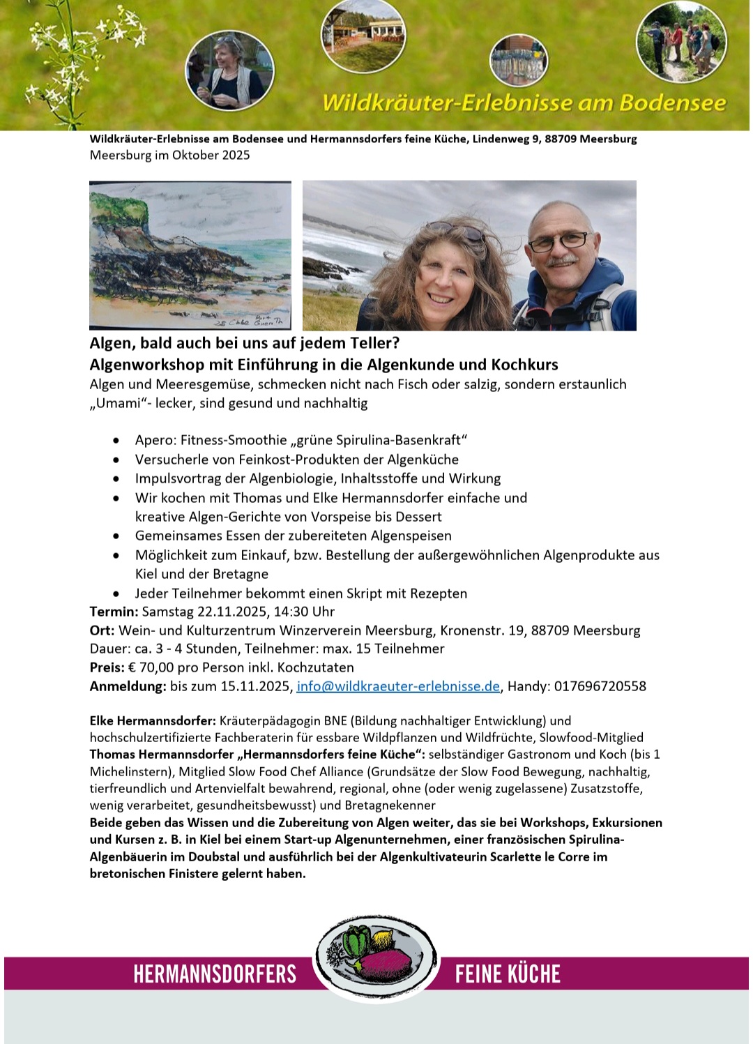 Nächste Veranstaltungen für alle, (siehe auch Newsletter unten) – 22.11. Algenworkshop in der Küche und im „kleinen Raum“ im Winzerverein Meersburg, Kronenstraße – 13.12. Weihnachtliches Buffet in der „Ortgalerie“ Daisendorf, Hauptstr. wo wir schon einige Events durchgeführt haben. Es gibt noch ein paar Plätze. – vor Weihnachten machen wir sicher noch Maultaschen und Wildragout im Glas.